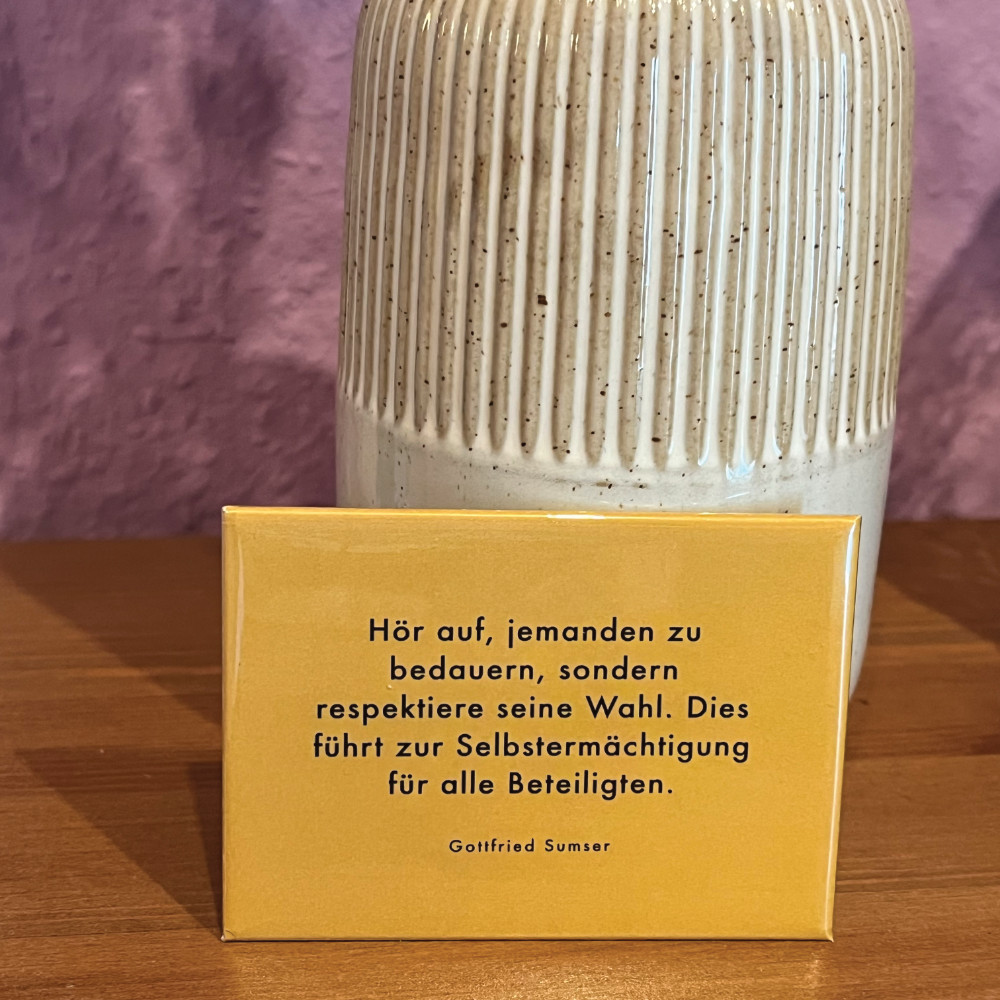 Unsere Magnet-Buttons mit ausgewählten Zitaten von Gottfried Sumser bringen diese stille Kraft in deinen Alltag – an den Kühlschrank, an dein Whiteboard oder an jeden Ort, der ein kleines Licht braucht.