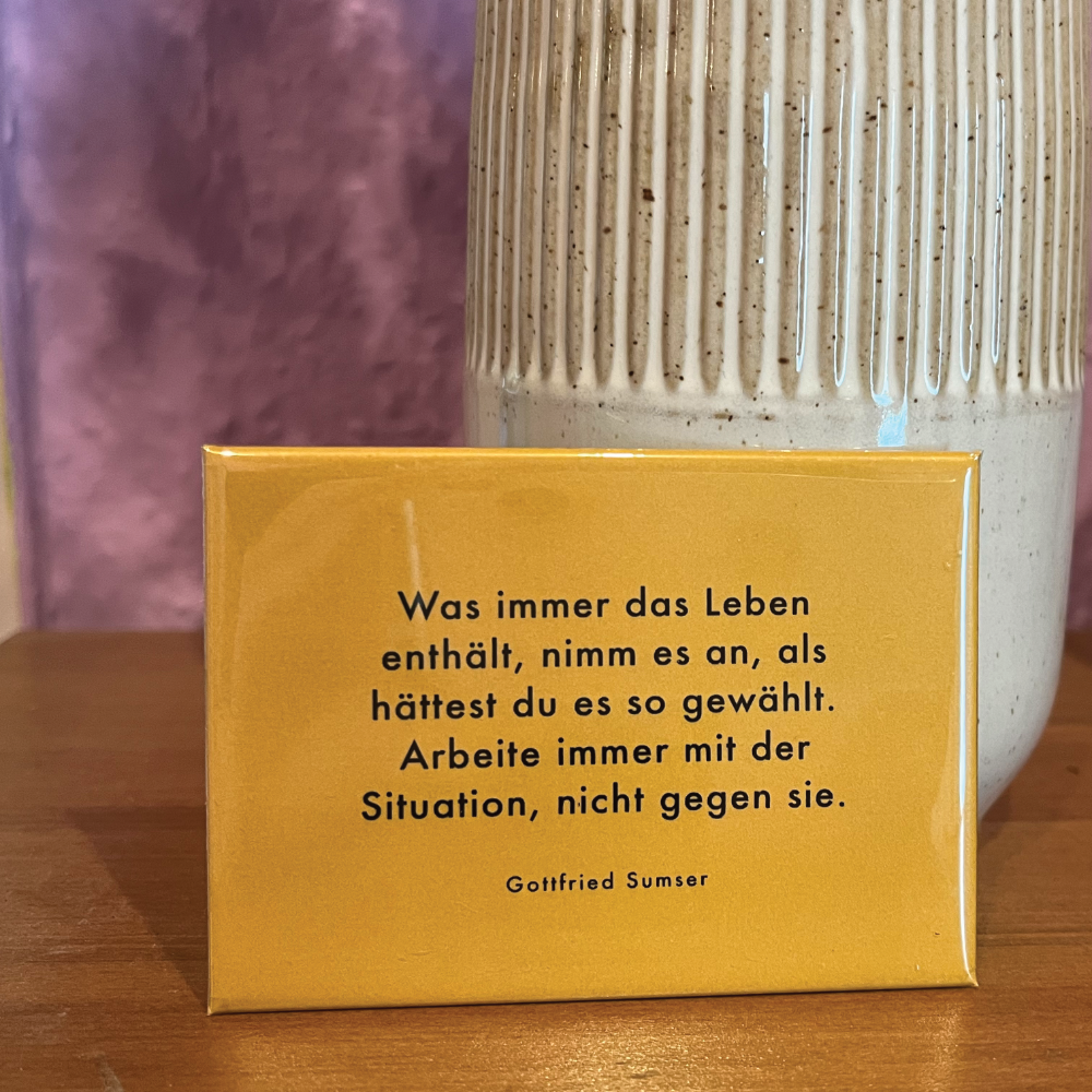 Unsere Magnet-Buttons mit ausgewählten Zitaten von Gottfried Sumser bringen diese stille Kraft in deinen Alltag – an den Kühlschrank, an dein Whiteboard oder an jeden Ort, der ein kleines Licht braucht.