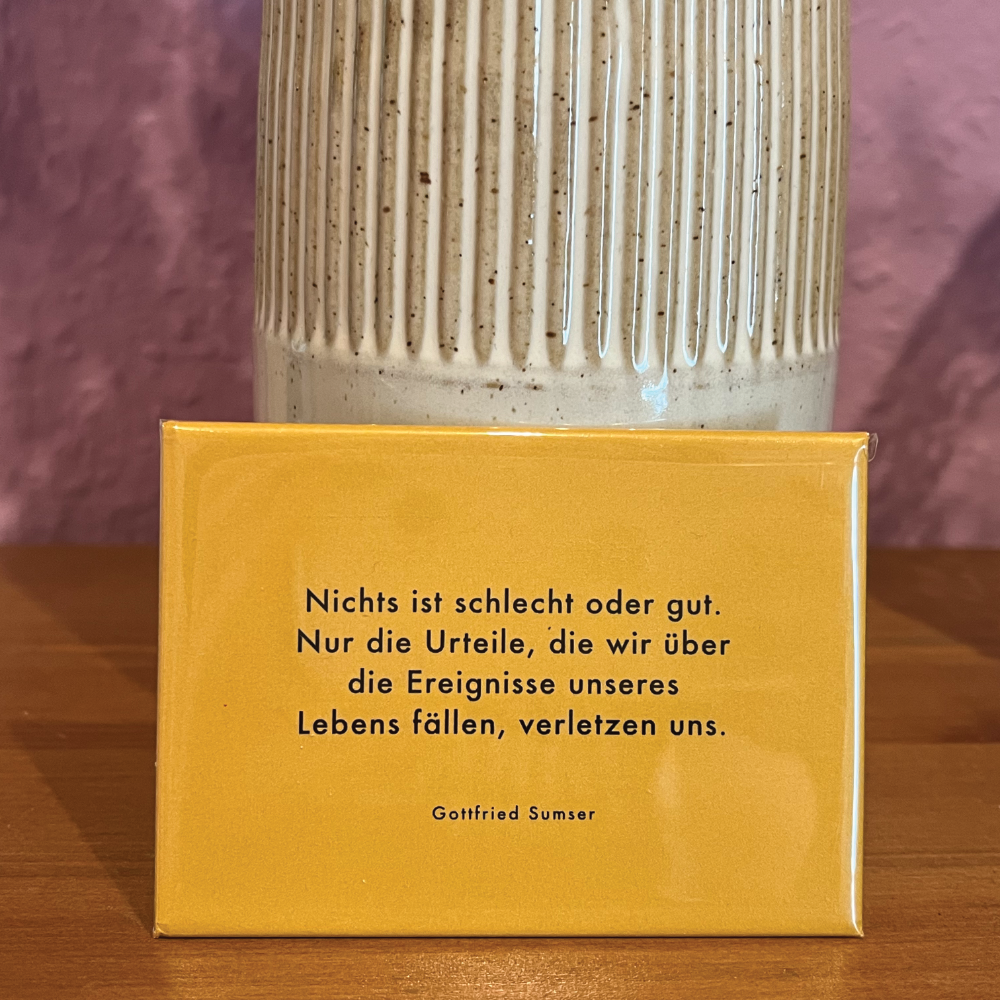 Unsere Magnet-Buttons mit ausgewählten Zitaten von Gottfried Sumser bringen diese stille Kraft in deinen Alltag – an den Kühlschrank, an dein Whiteboard oder an jeden Ort, der ein kleines Licht braucht.