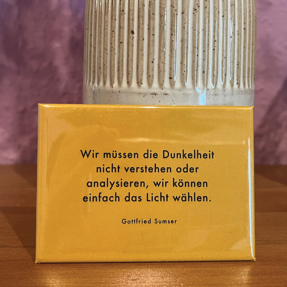 Unsere Magnet-Buttons mit ausgewählten Zitaten von Gottfried Sumser bringen diese stille Kraft in deinen Alltag – an den Kühlschrank, an dein Whiteboard oder an jeden Ort, der ein kleines Licht braucht.