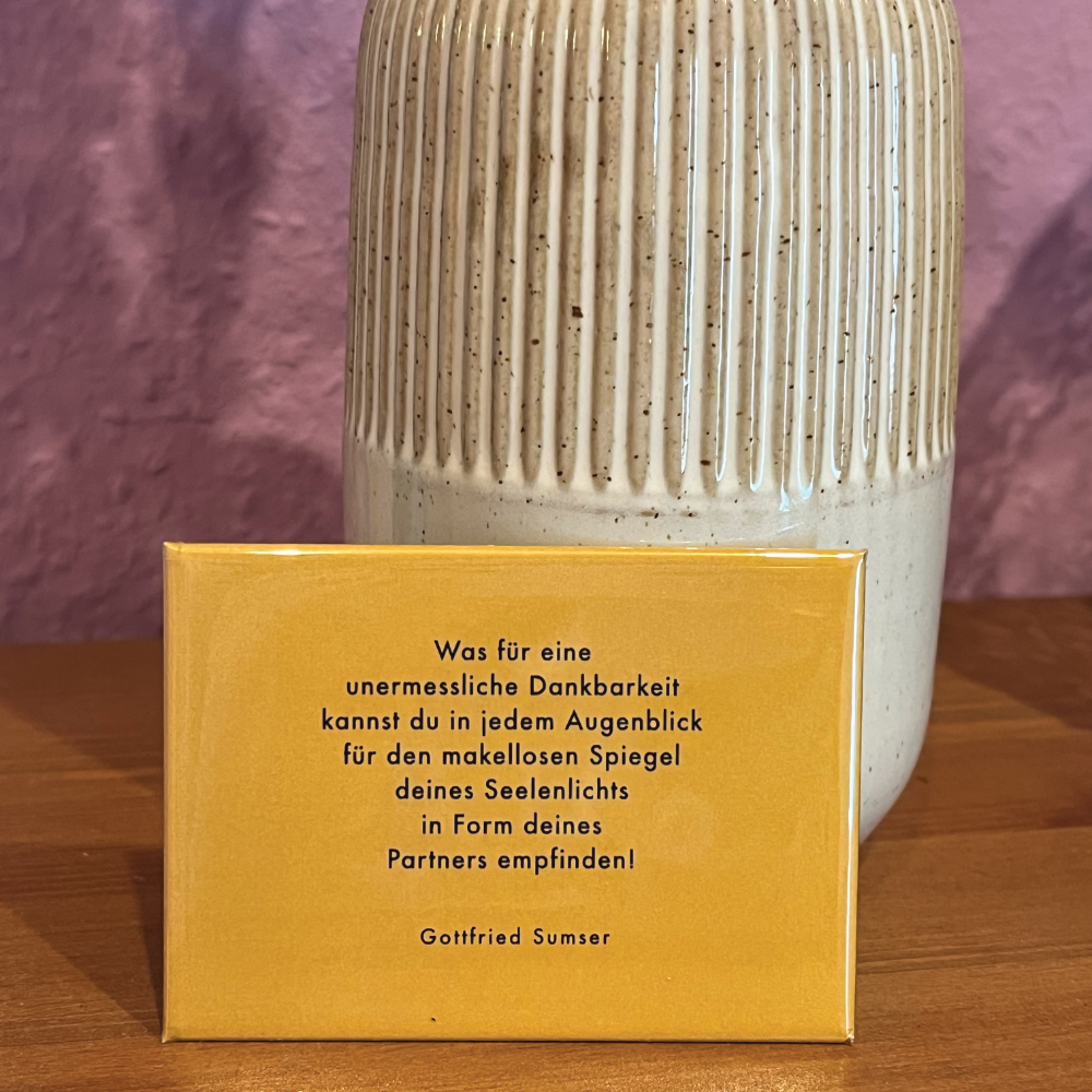 Unsere Magnet-Buttons mit ausgewählten Zitaten von Gottfried Sumser bringen diese stille Kraft in deinen Alltag – an den Kühlschrank, an dein Whiteboard oder an jeden Ort, der ein kleines Licht braucht.