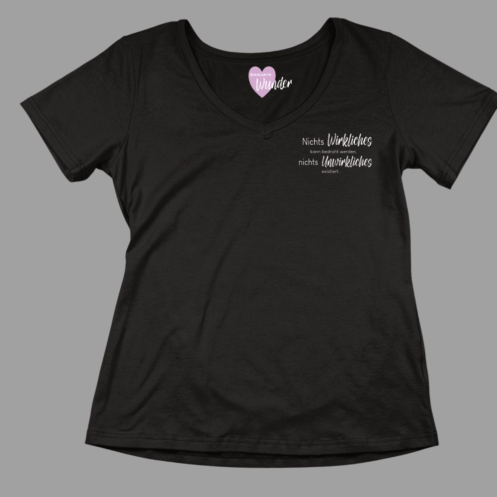 Damen-T-Shirt mit der Botschaft „Nichts wirkliches kann bedroht werden, nichts Unwirkliches existiert“, lass diese Botschaft wirken.