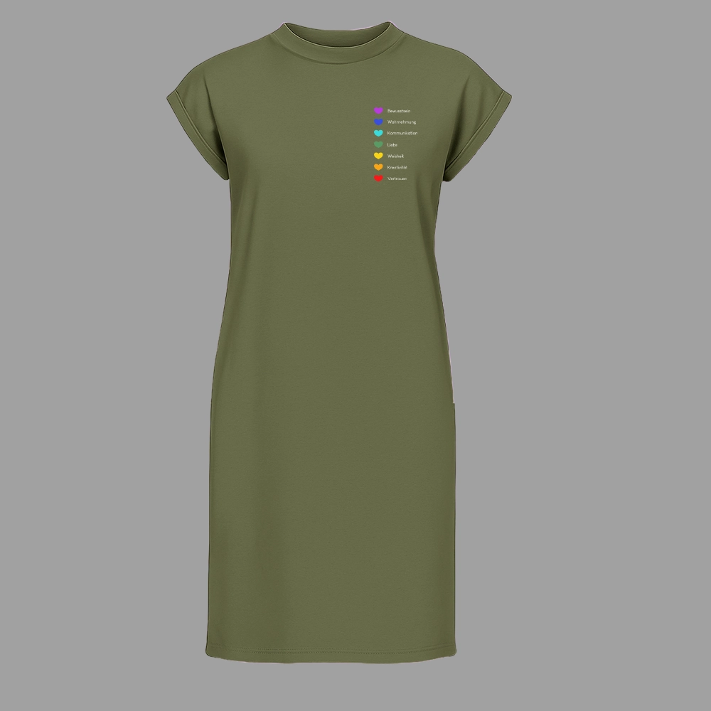 Frauen Kleid kurzarm mit der Botschaft „7 Chakren für deine Yogastunde“ womit du dich jederzeit verbinden kannst.