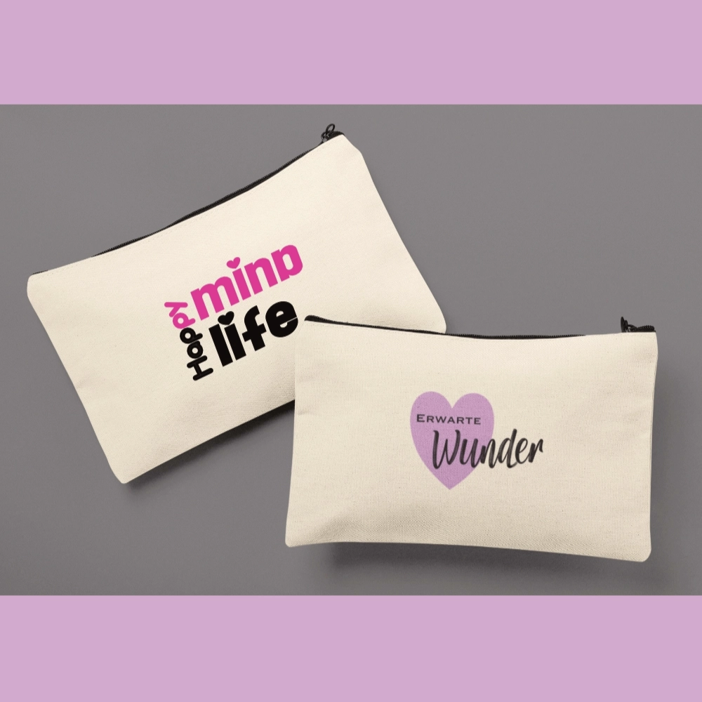 Universaltasche/ Kosmetiktasche mit der Botschaft „Happy Mind, Happy Life“ so wahr, dass wir es in jedem Moment leben dürfen.