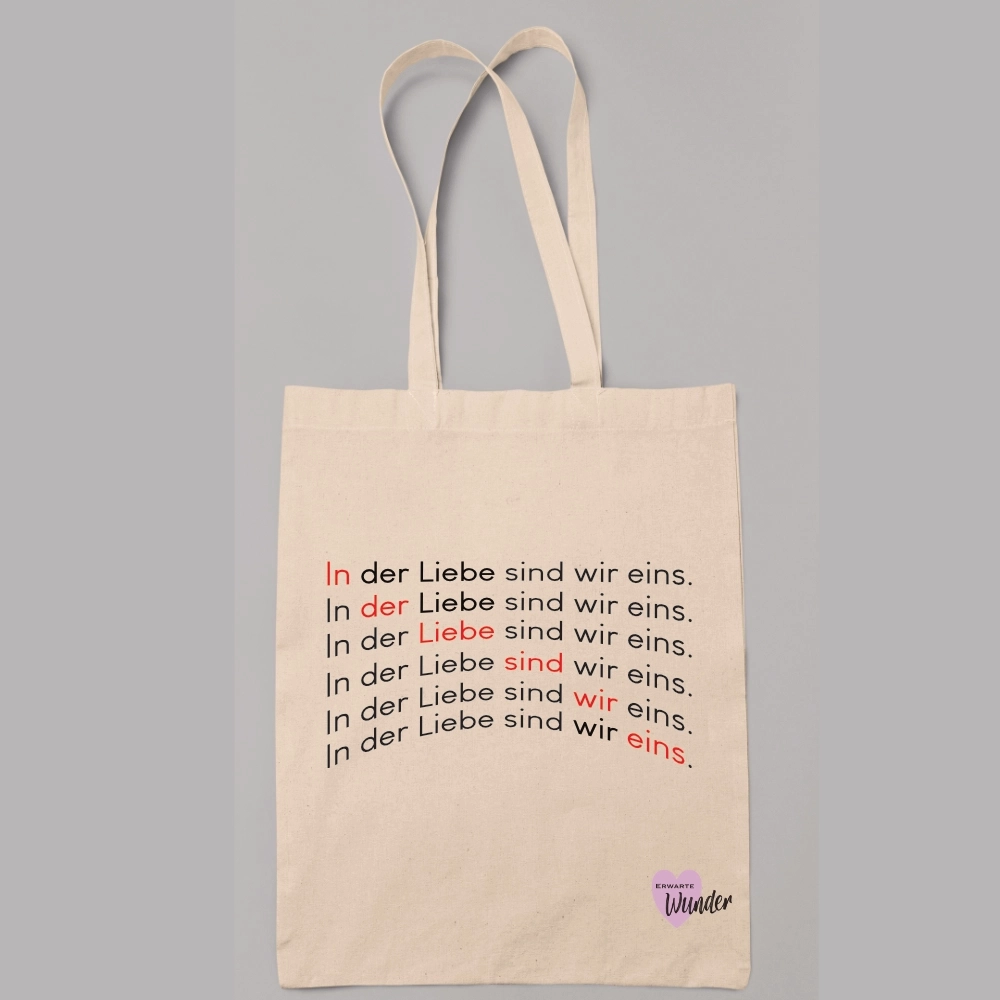 Baumwollstoffbeutel/ Shopping Bag mit der Botschaft „In der Liebe sind wir eins“, hierin steckt so viel Wahrheit.