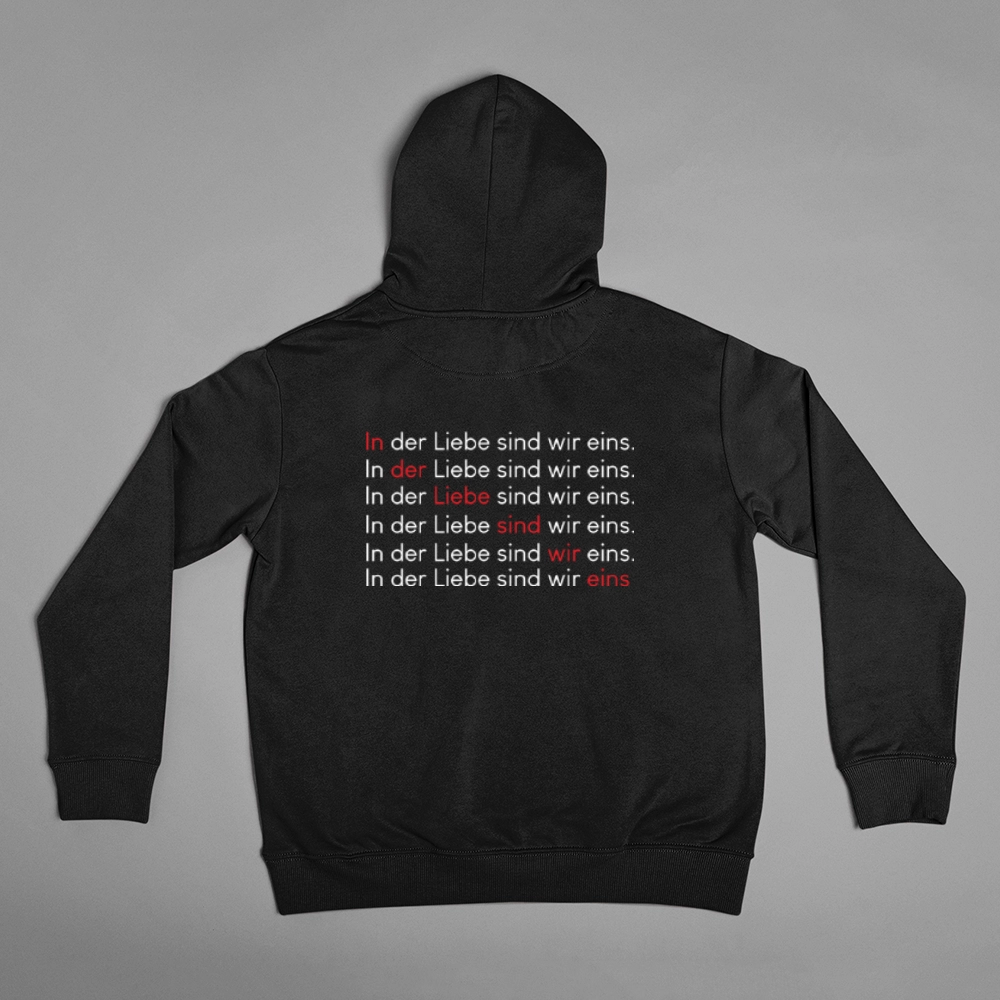Unisex Hoodie mit der Botschaft „In der Liebe sind wir eins.“ Fühle dies.