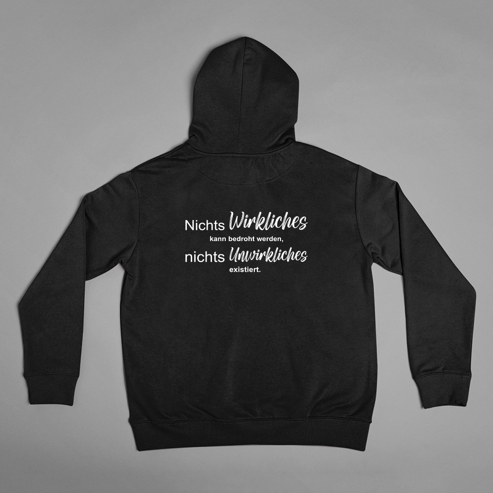Unisex Hoodie mit der Botschaft „Nichts Wirkliches kann bedroht werden, nichts Unwirkliches existiert.“ lasse dies ein mal wirken.