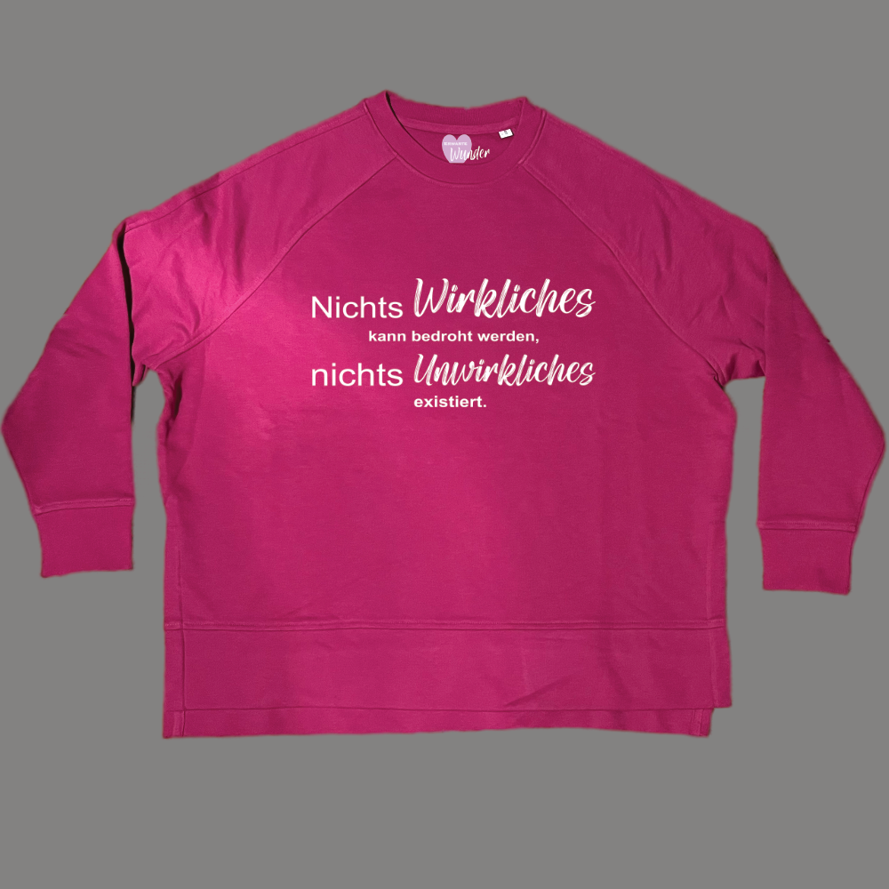 Damen Sweatshirt oversize mit der Botschaft „Nichts wirkliches kann bedroht werden, nichts Unwirkliches existiert“, lass diese Botschaft wirken.