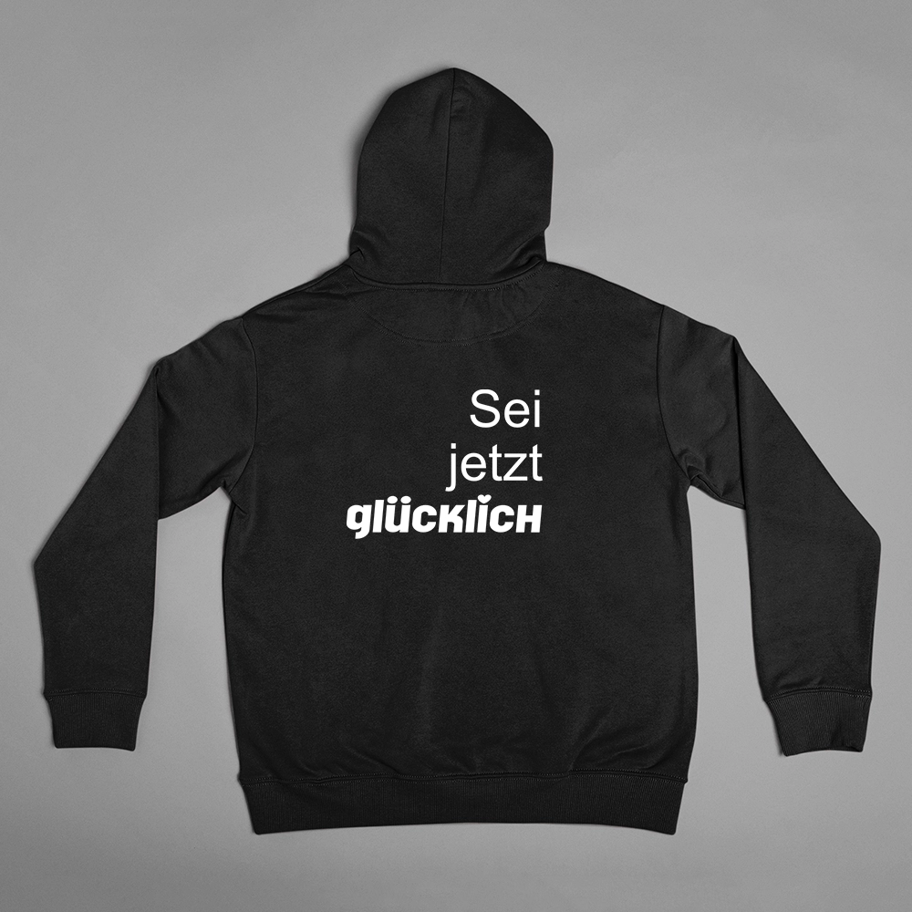 Unisex Hoodie mit der Botschaft „Sei jetzt glücklich“, beginne direkt damit.