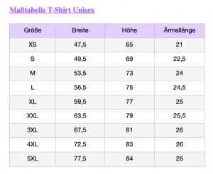 T-Shirt Unisex Maßtabelle