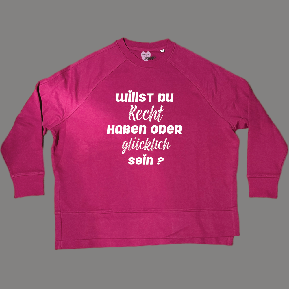 Damen Sweatshirt oversize mit der Botschaft „Willst du Recht haben oder glücklich sein?“ beachte dies in der nächsten Situation.