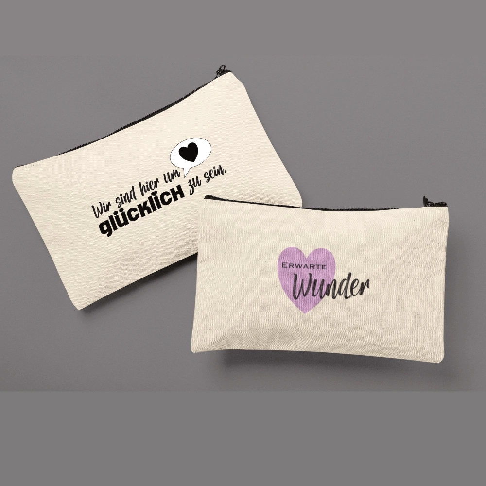 Universaltasche/ Kosmetiktasche mit der Botschaft „wir sind hier um glücklich zu sein“, lass es uns zusammen leben.