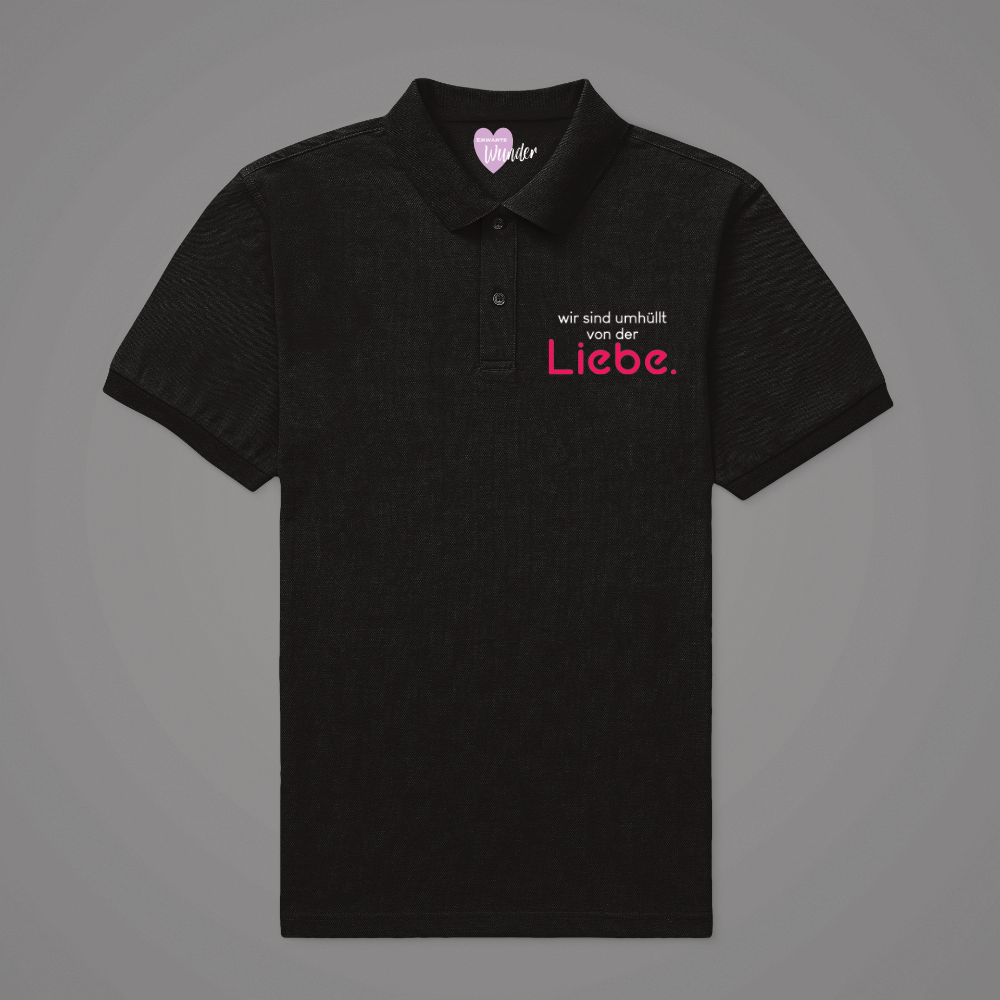 Damen Poloshirt mit der Botschaft „Wir sind umhüllt von der Liebe“, und in jedem Moment gehalten.